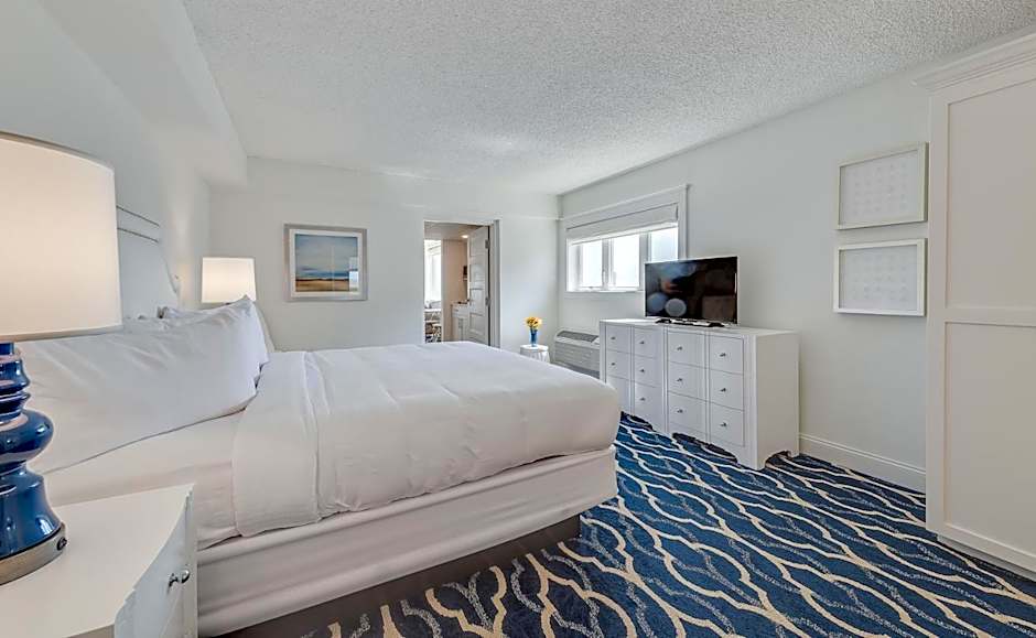 The Oceanfront Suite features a bedroom with a king bed, flatscreen tv and en suite bath. The living room features picture windows with views of the Atlantic Ocean, an additional bathroom, a galley kitchen with compact refrigerator, microwave, cooktop, sink, cookware and dishes, a small dining area, and a sitting area with flatscreen tv and a queen murphy bed.